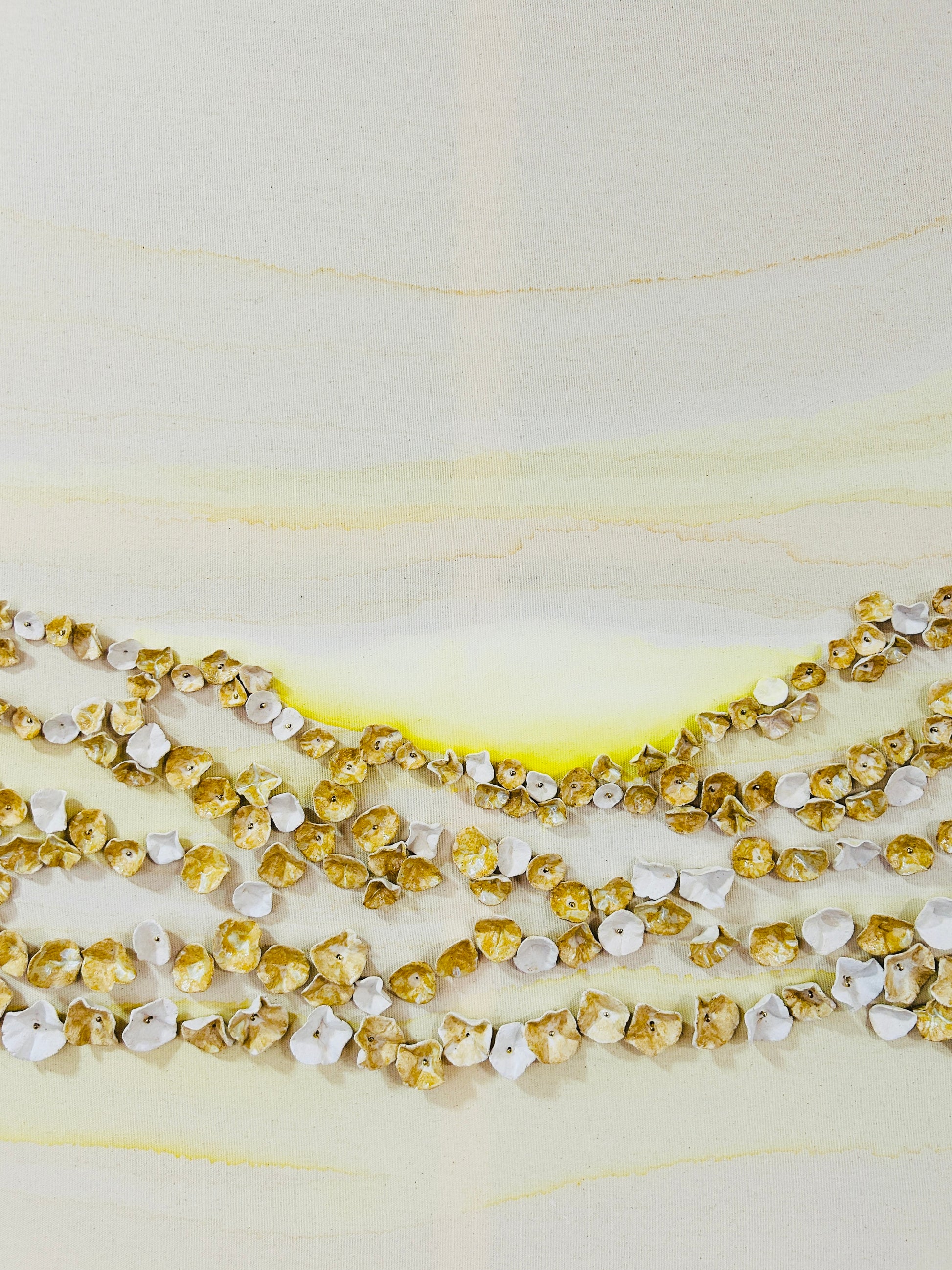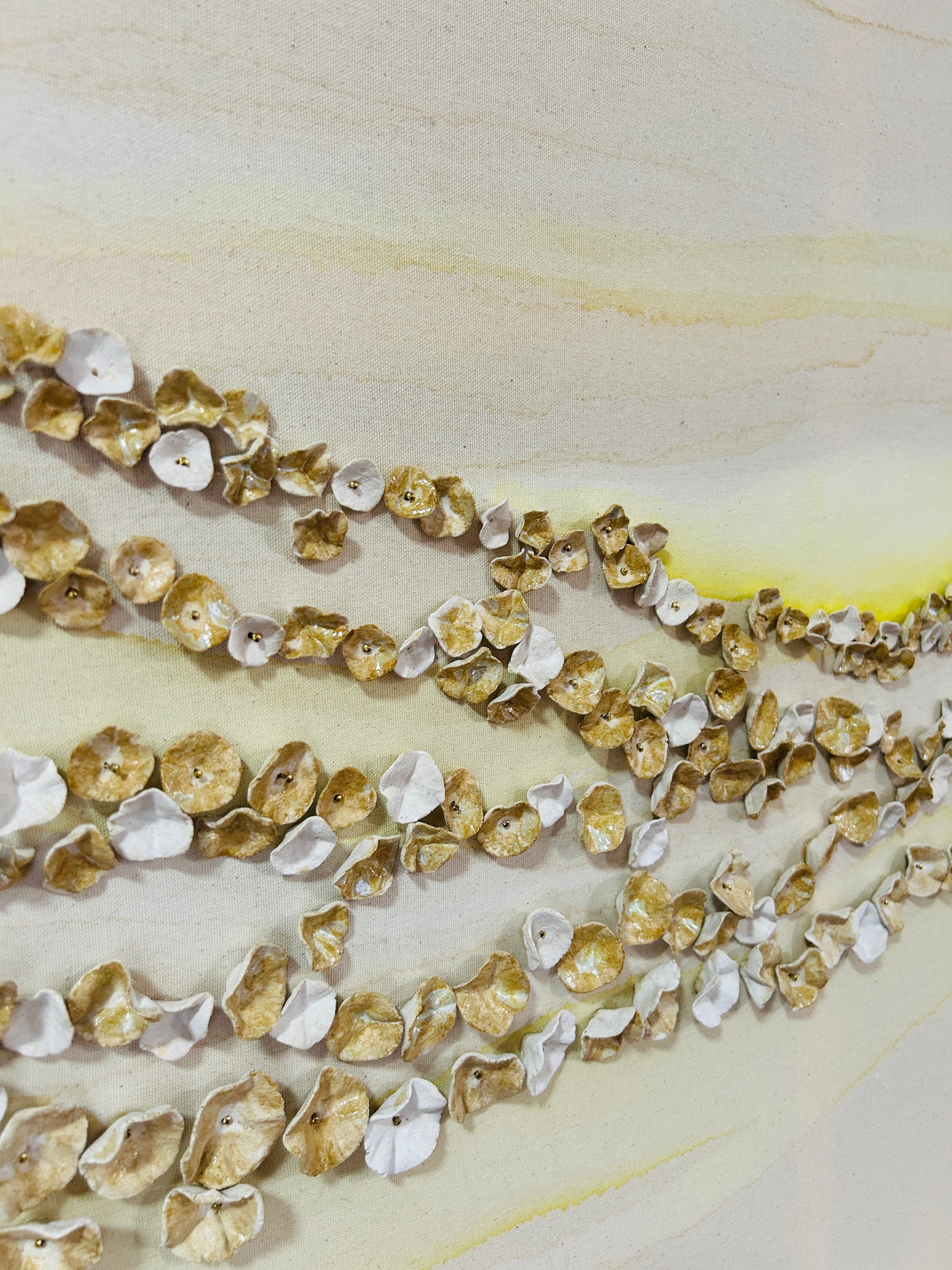 The hundreds of ceramic pieces are then fired twice, and each one is curated and meticulously placed onto the raw canvas complimenting the ink + water design and composition.
