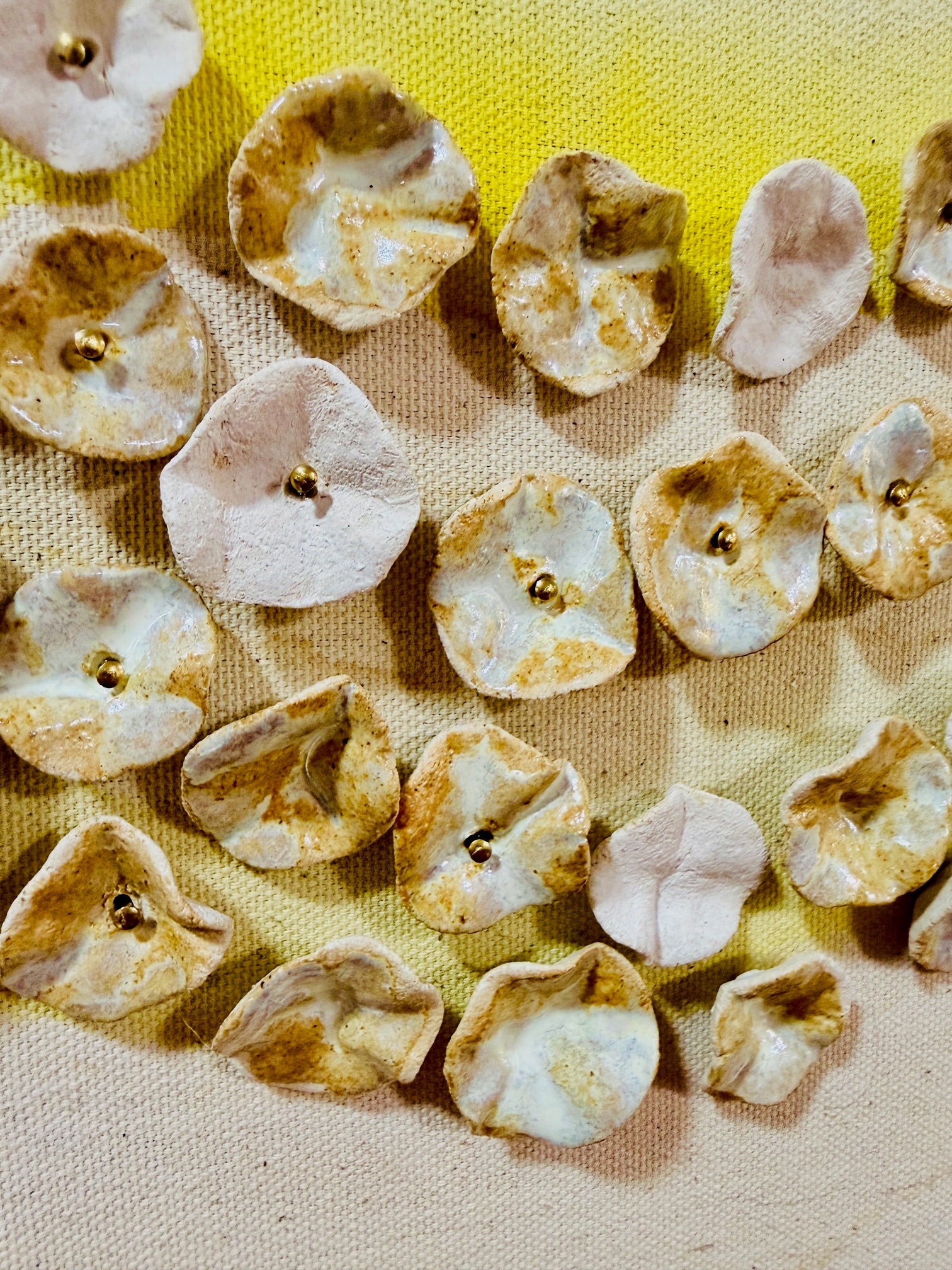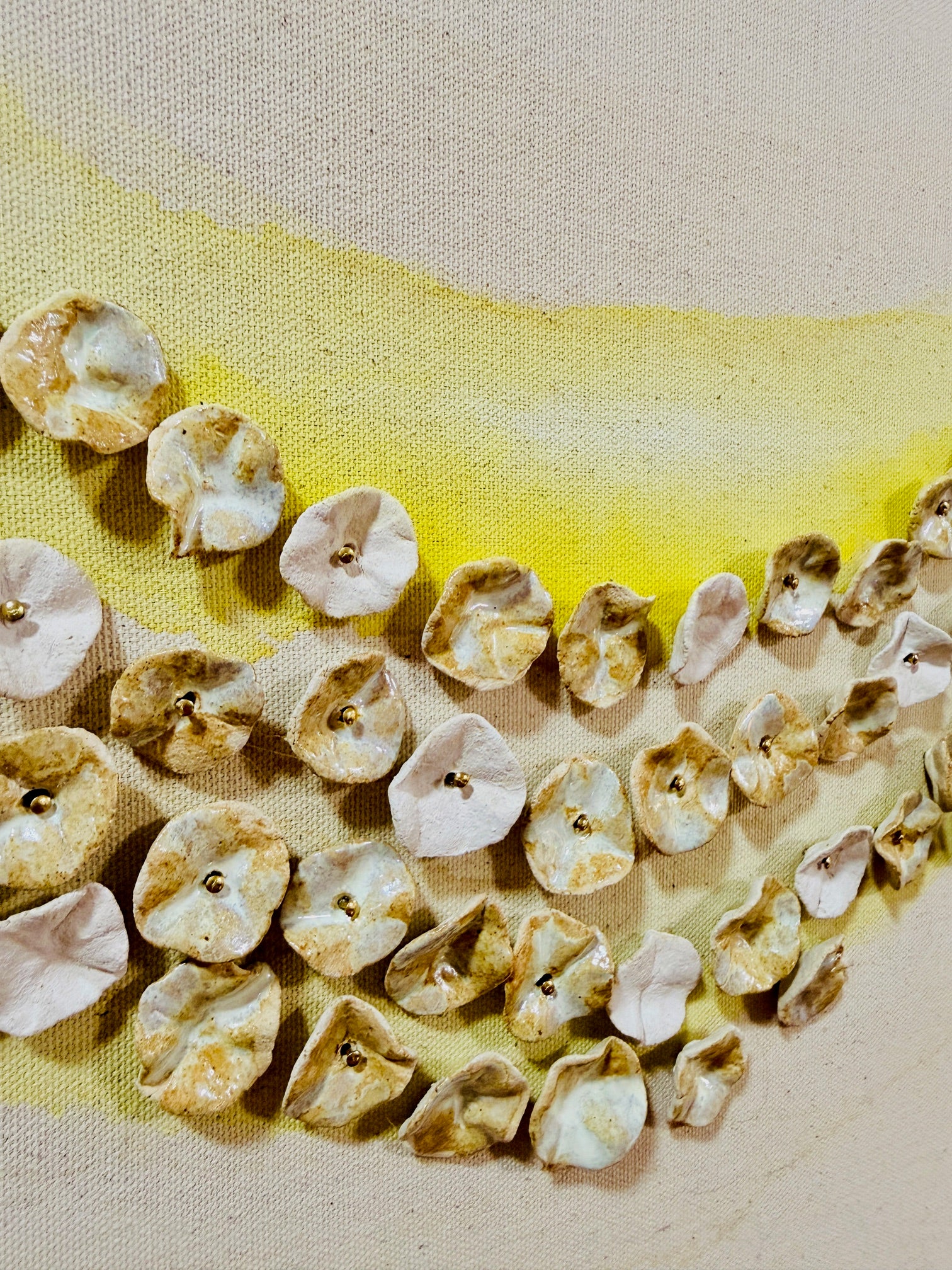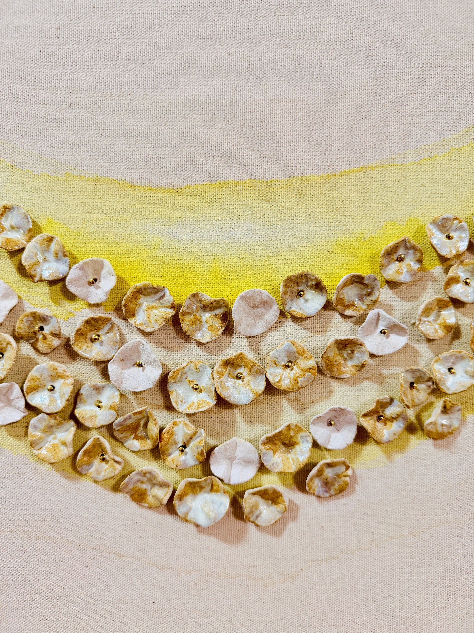 The hundreds of ceramic pieces are then fired twice, and each one is curated and meticulously placed onto the raw canvas complimenting the ink + water design and composition.