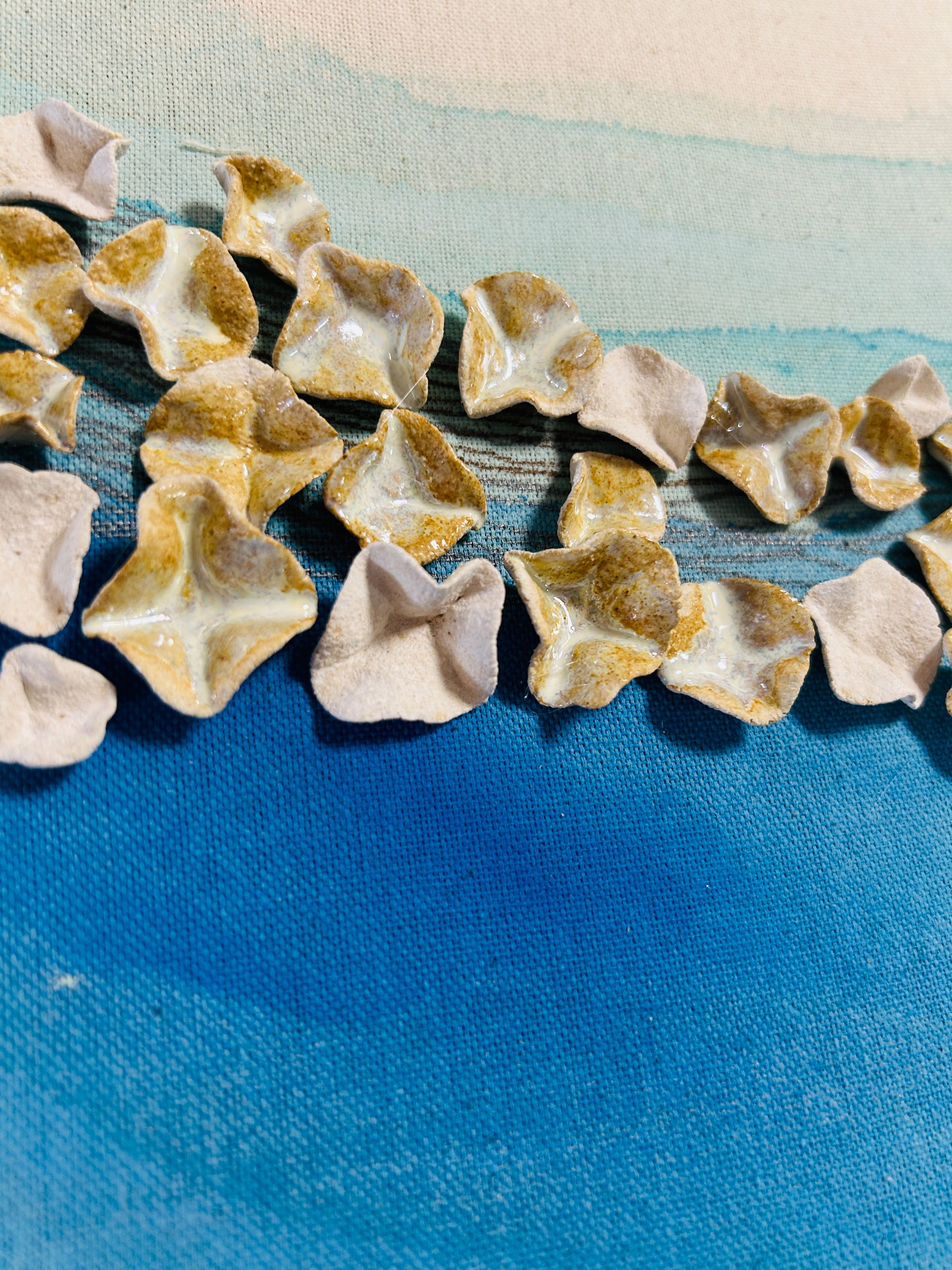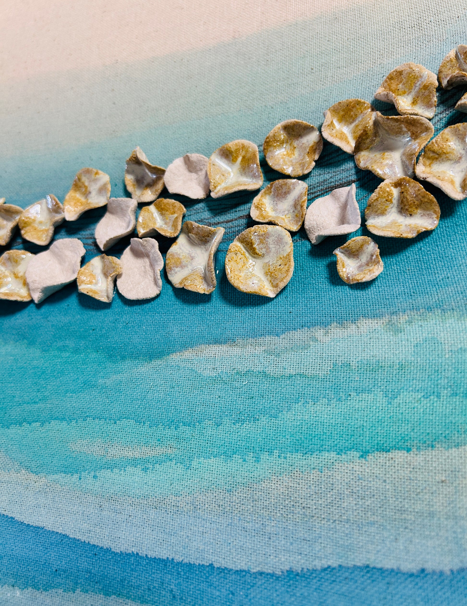 The hundreds of ceramic pieces are then fired twice, and each one is curated and meticulously placed onto the raw canvas complimenting the ink + water design and composition.